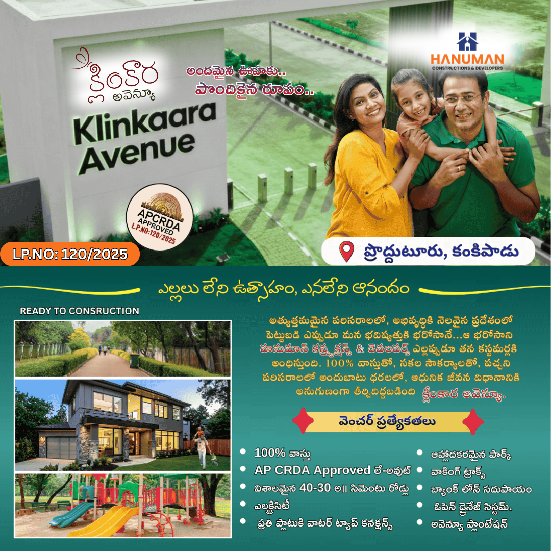 Klinkaara Avenue offers 100% Vastu-compliant, AP CRDA–approved plots in a fully developed, ready-to-construct layout. With 40 ft & 30 ft cement roads, electricity, individual water tap connections, open drainage, and avenue plantation, the venture ensures a clean, modern, and eco-friendly environment. Residents enjoy a beautiful park, walking tracks, and easy bank loan facilities—making it a perfect choice for peaceful living and smart investment.